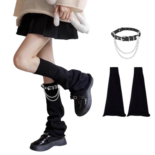 Black Leg Warmers for Women, 2PCS Set with Gothic Leg Chain, 48 cm Length, Stretchy Knitted Legwarmers for Dance, Yoga, Winter Protection, 80s Themed Parties, Street Fashion