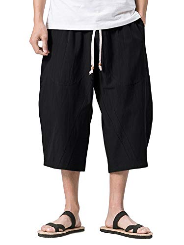 KEFITEVD Men's Casual Boho Shorts 3/4 Length Beach Cotton Linen Wide Leg Trousers Elasticated Waist Long Shorts Black, 38