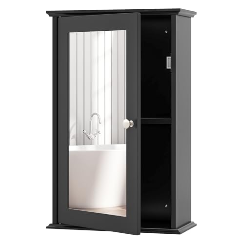 CASART Bathroom Mirror Cabinet, Wall Mounted Storage Cupboard with Single Door and Adjustable Shelves, Wooden Medicine Cabinet Display Organizer Unit for Bathroom Kitchen Living Room (Black)