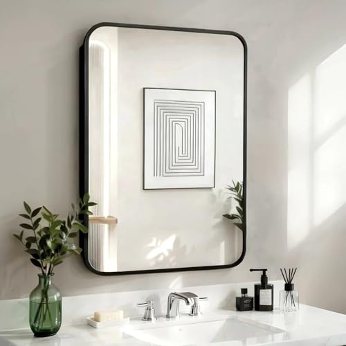 Fundin Mirror Medicine Cabinet for Bathroom - Metal Framed Round Corner Door, Adjustable Shelves, Matte Black, Surface Mount Wall Mounted - 38 x 65 cm