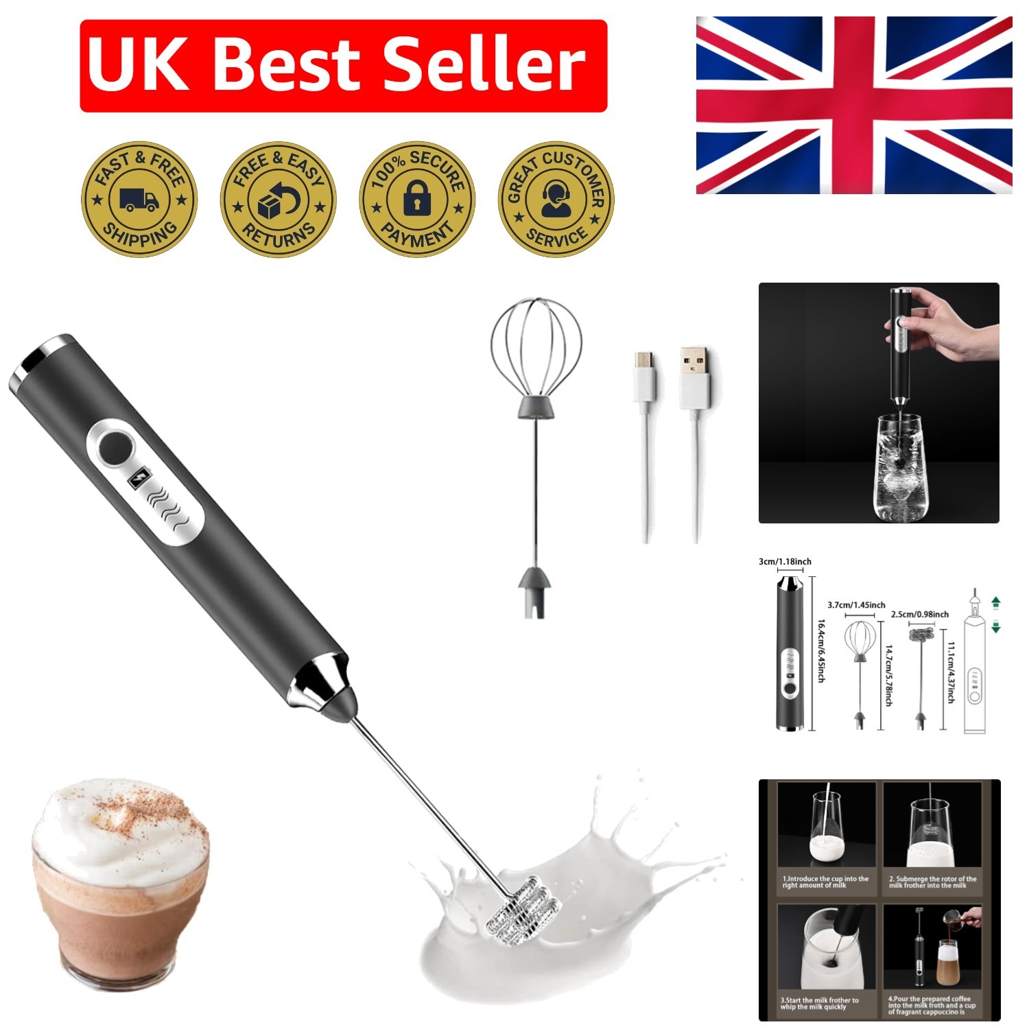 Versatile Black Milk Frother - USB Rechargeable for Cappuccinos, Lattes & More