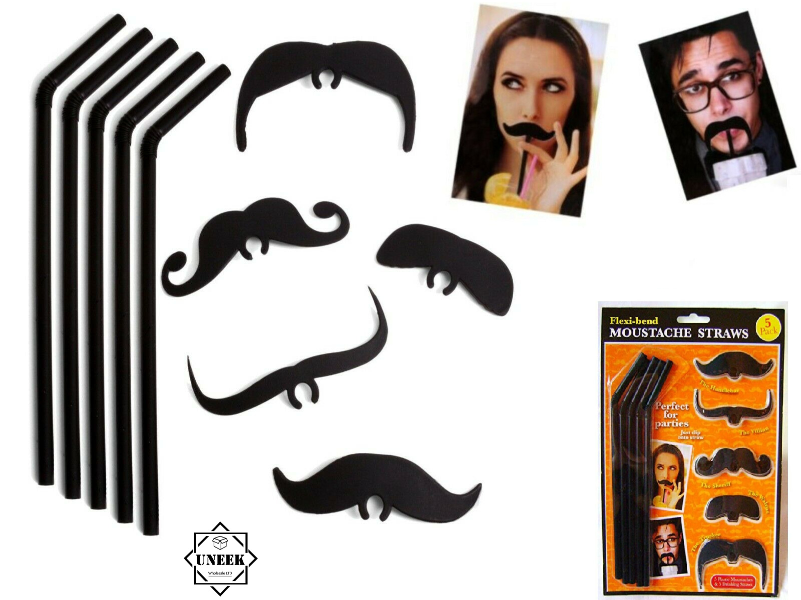5 x Black Moustache Drinking Straws Flexi Fun Party Hen Night Stag Do Accessory