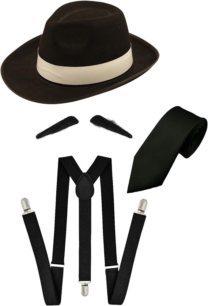 Lizzy 1 x Black Al Capone Gangster Hat with Pencil Moustache Black Tie + Black Braces | 1920’s Pimp Gangster Fancy Dress Accessories