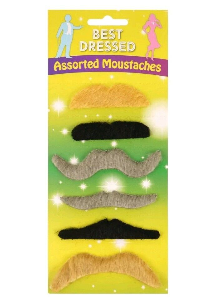 *6 Pack* Blonde Grey Black Tash Moustache Facial Hair Hippy 70s Fancy Dress