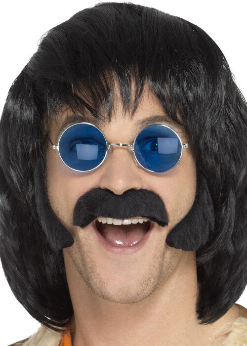 60S ROCK SERGEANT SET BLACK SHORT WIG + COLOURED ROUND GLASSES + BLACK MOUSTACHE CELEBRITY FANCY DRESS ACCESSORY KIT 60S POP SERGEANT