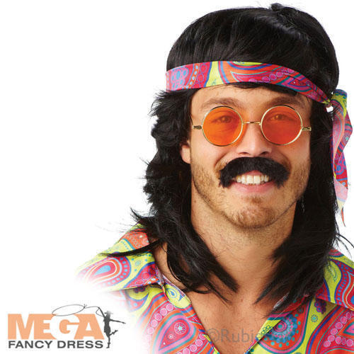 70's Black Moustache Fancy Dress Hippie Tash 1970s Adult Costume Mens Accessory