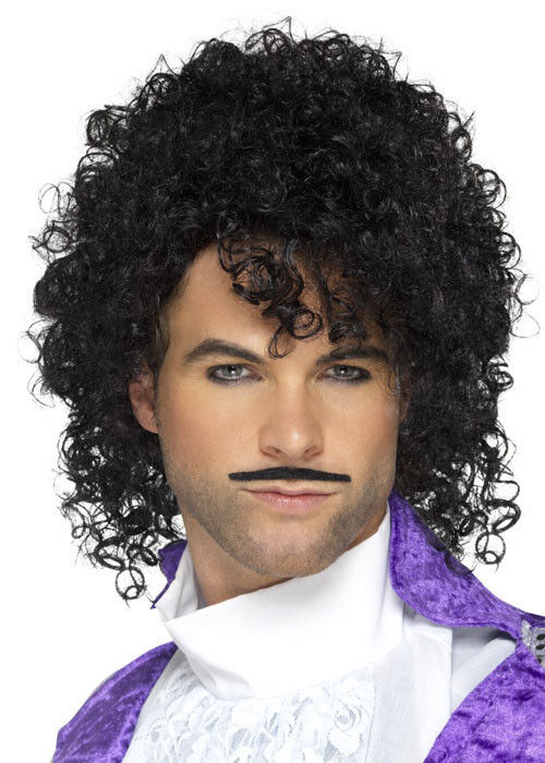 Prince Style 80s Curly Black Wig and Moustache Kit