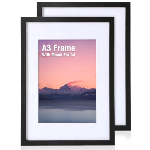 Zemiu 2Pack Premium A3 Picture Frame with Mount for A4, Solid Wood Photo Frame 29.7x42 cm with Acrylic Glass/Hanging Hooks, for Wall/Desk Pictures Print Display -Black