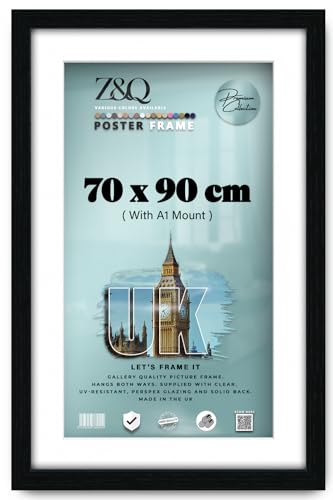 Z&Q Extra Large Poster Frame 70 x 90 cm With Mount For A1 Picture Black Frame Extra Large Vertical & Horizontal Wall Hanging Picture Photo Print HD Clear Plexiglas MDF Backboard With Steel Hooks