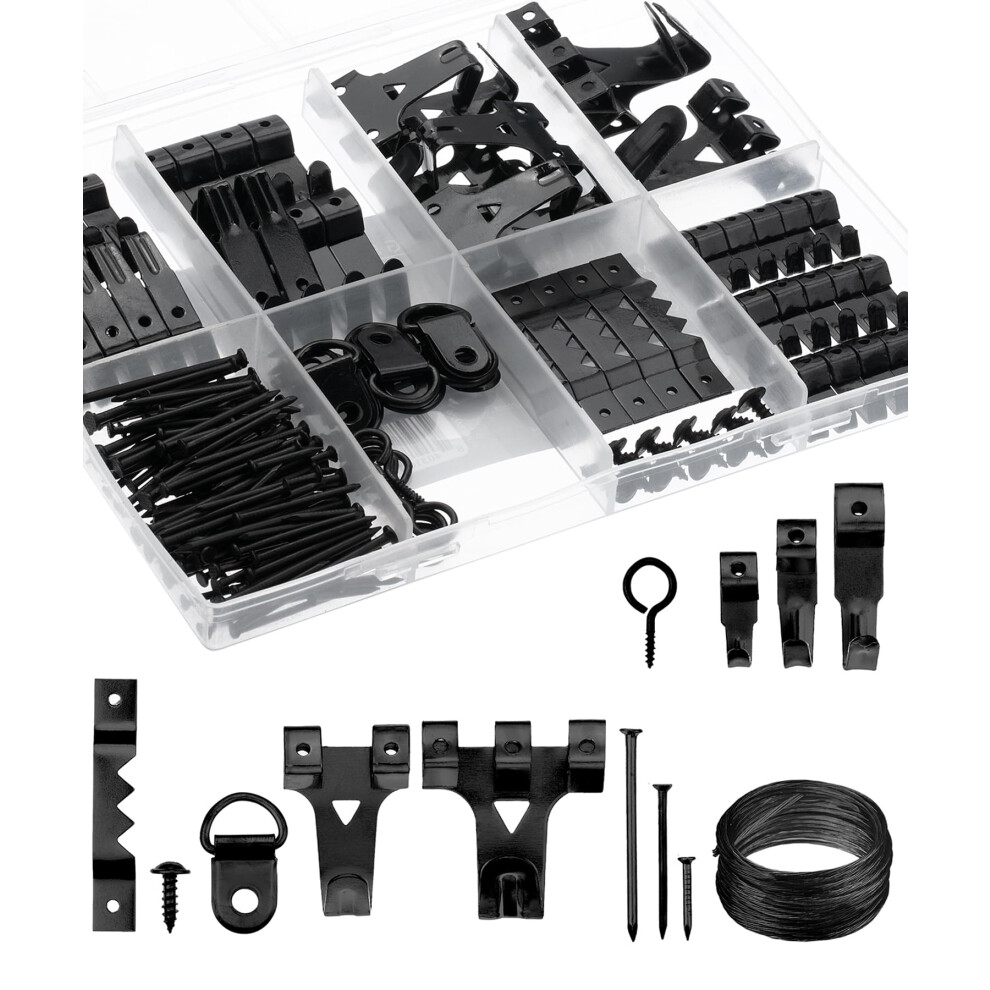 Picture Hooks for Hard Walls, 250PCS Picture Hanging Kit for Picture Frame Heavy Duty Picture Hanging Hooks Picture Hangers Set with Picture Wire, Nails, Sawtooth Hangers, D-Ring, Screw Eyes, Black