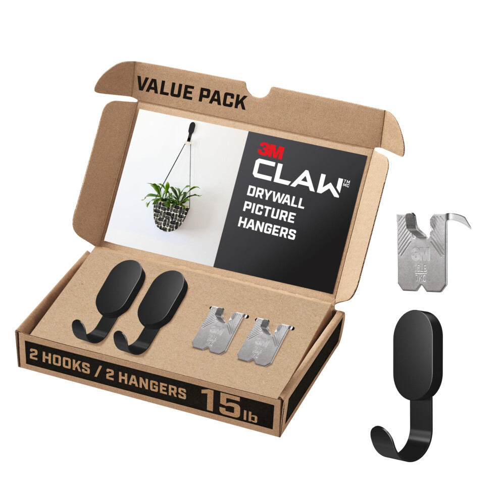 3M CLAW 15 lb. 2 Drywall Black Hooks & 2 Extra Picture Hangers Heavyweight Hanging Solution for Backpacks Jackets Pictures and Room Decor Cute Wal