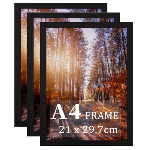 Uhogo A4 Frame Black Set of 3-21 x 29.7cm Picture Frame A4 Photo Frame with Safe Perspex Front and Hanging Hooks - Wall and Tabletop Display, Landscape or Portrait, Black