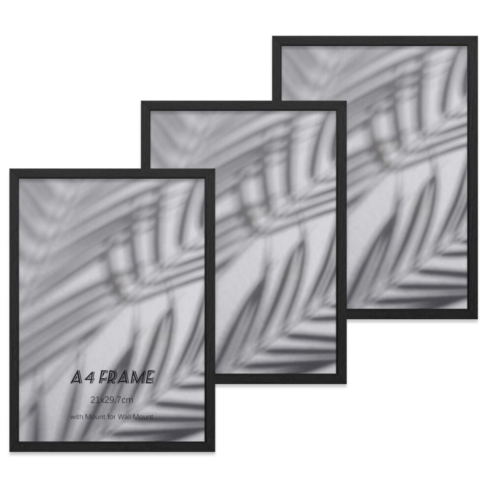YONGHUO A4 Frame, 3 Pack Wooden A4 Picture Frames, Black A4 Frames, 21 x 29.7cm, with Plexiglass, Wall Hooks, Stand and Mat, for Tabletop or Wall
