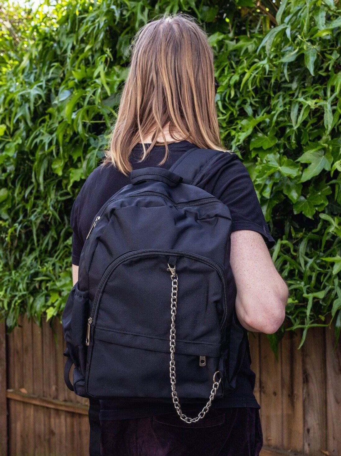 PLAIN BLACK Backpack with chain Rucksack School Travel Work EMO GOTH Laptop Bag