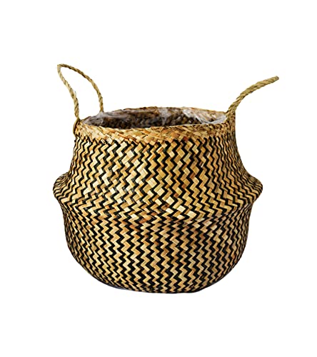 Ivyline Seagrass Chevron Small Black Lined Basket Planter - Hand Finished, Stylish & Waterproof - Decorative Woven Indoor Flower Pot - H25cm x D30cm