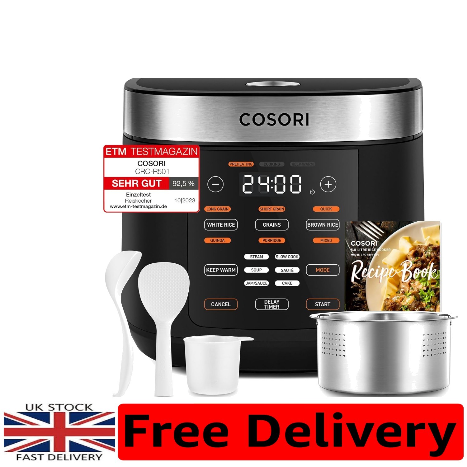 COSORI Rice Cooker, Slow Cooker & Steamer with Ceramic Coated Inner Pot and Fuzzy Logic, 50 Recipes,10 Cups, 5L Capacity, with 17 Functions, Warmer, Timer, Black