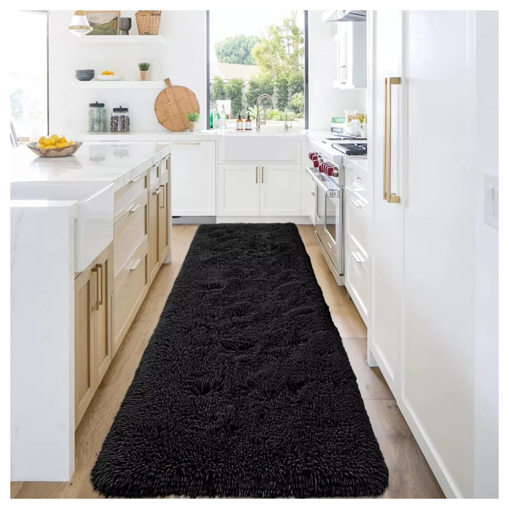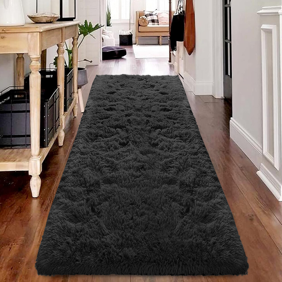 (60cm x 220cm (2ft x 7ft 3")- Runner Rug ) Black Rugs Carpet Runner Mat Fluffy Shaggy Rug