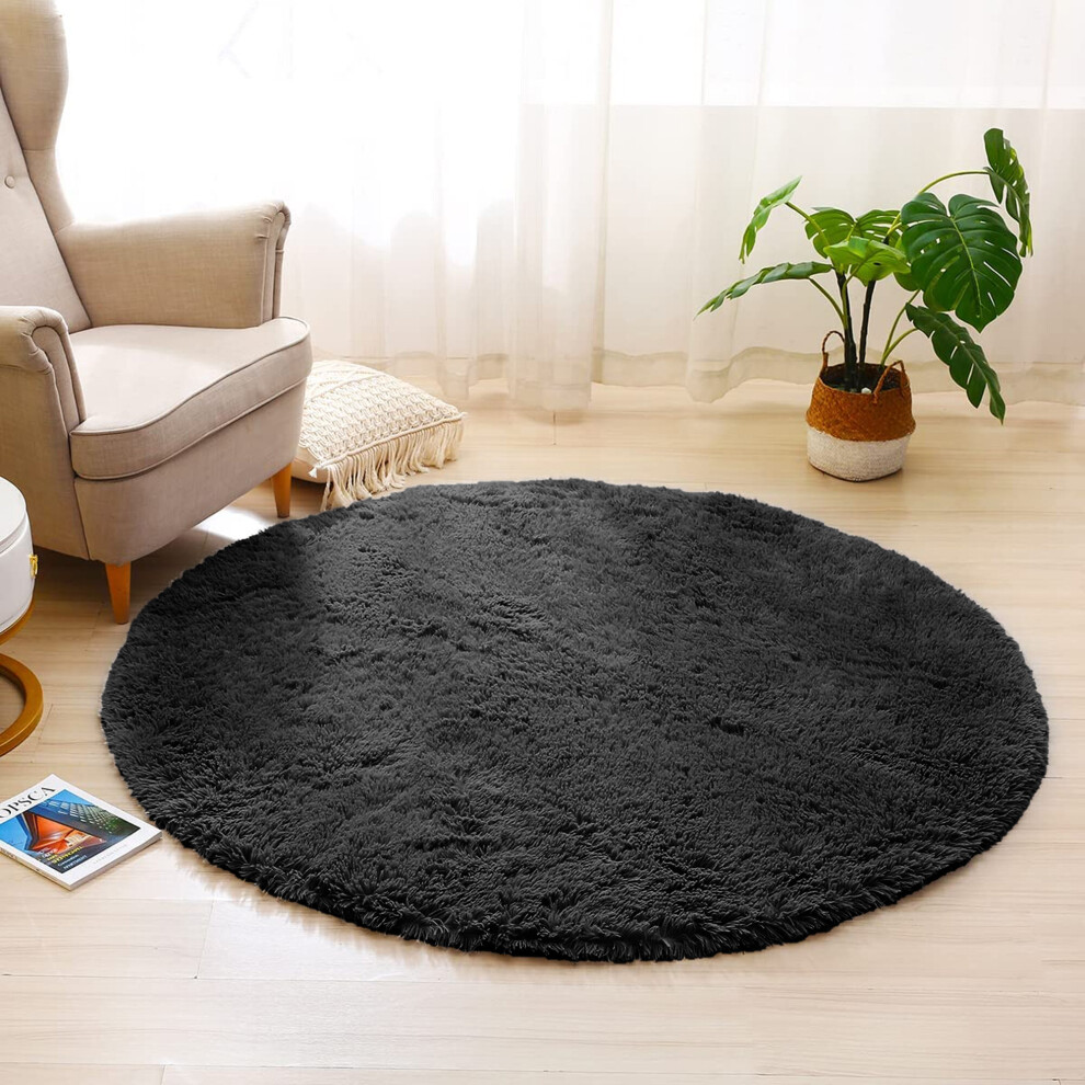 (120cm x 120cm (4ft x 4ft)- Circle Round Rug) Black Rugs Carpet Runner Mat Fluffy Shaggy Rug