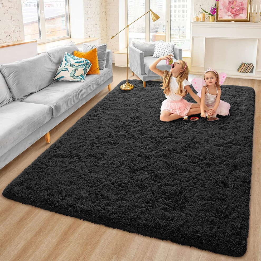 (120cm x 170cm (4ft x 5ft 6")- Area Rug) Black Rugs Carpet Runner Mat Fluffy Shaggy Rug