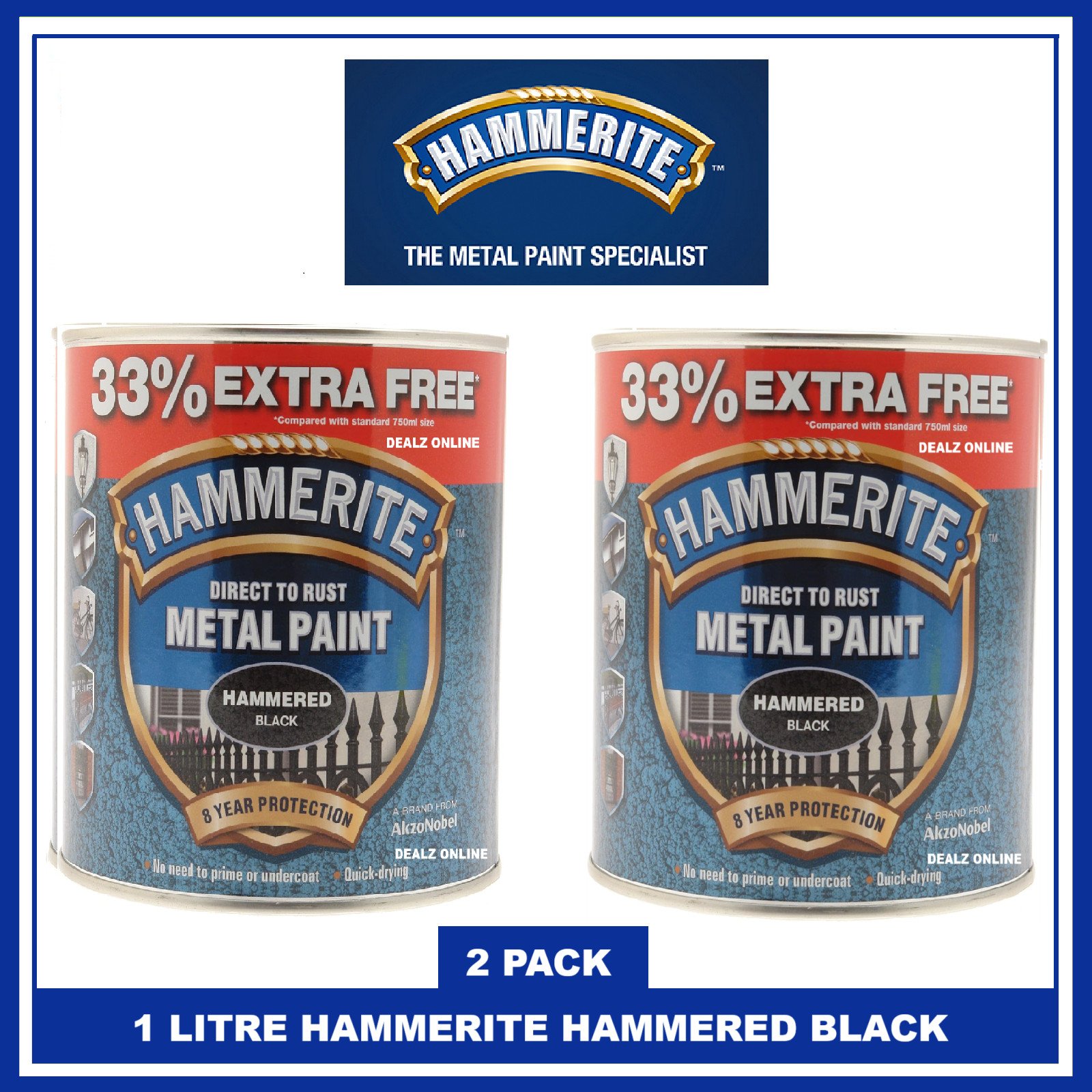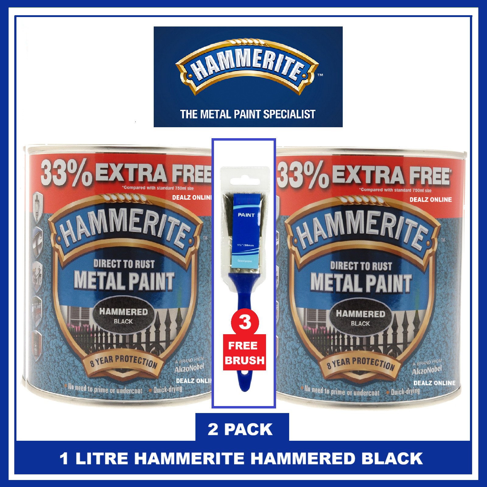 Hammerite Hammered BLACK Metal Direct Rust Paint 1 LITRE X 2 + 3 SET BRUSHES