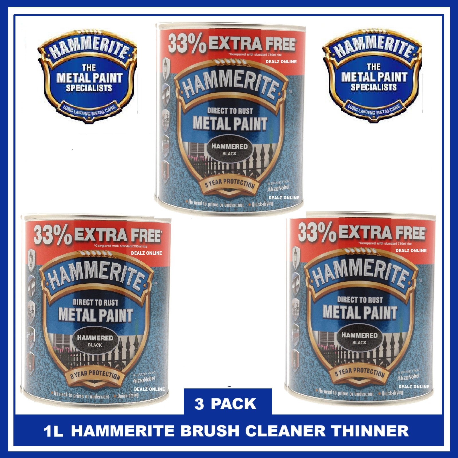 Hammerite Hammered BLACK Metal Direct Rust Paint 1 LITRE X 3 + 3 SET BRUSHES