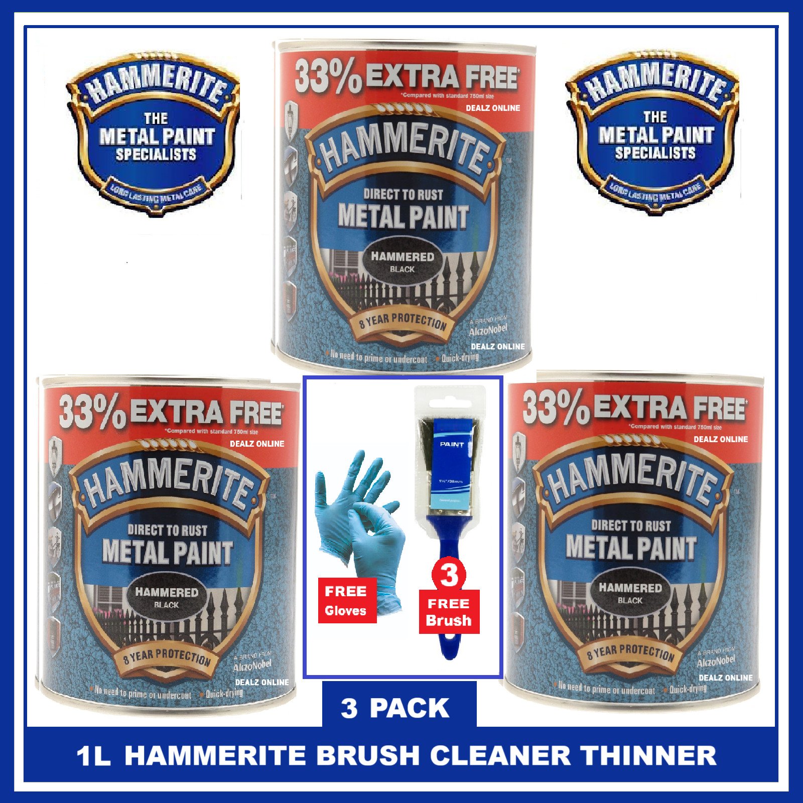 Hammerite Hammered BLACK Metal Direct Rust Paint 1 L X 3 + GLOVE & 3 BRUSHES