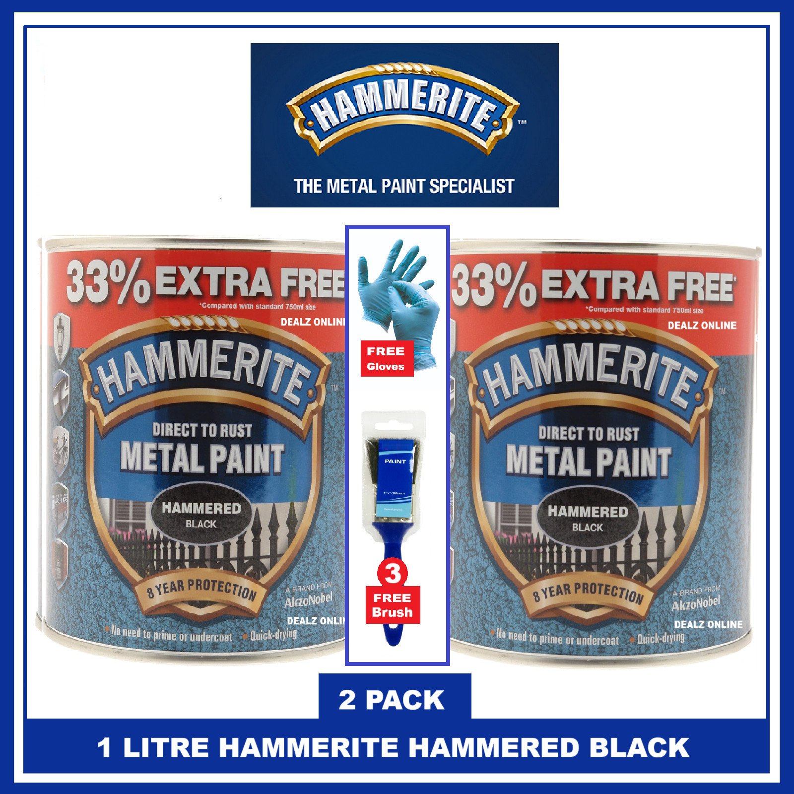 Hammerite Hammered BLACK Metal Direct Rust Paint 1 L X 2 + 3 BRUSHES & GLOVES
