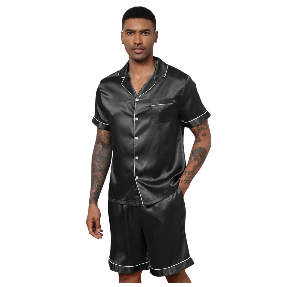 SWOMOG Men Satin Pyjamas Sets Short Sleeve Button-Down Sleepwear Two-Piece PJs Sets Loungewear with Pockets Black
