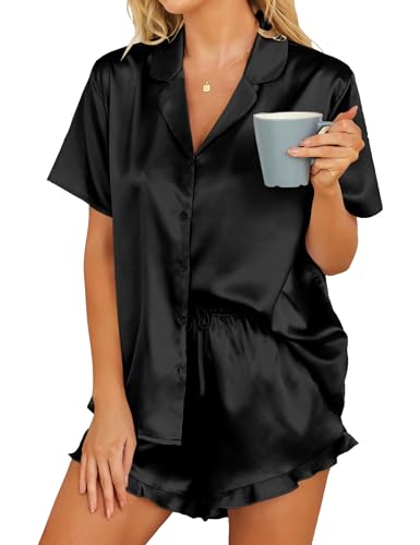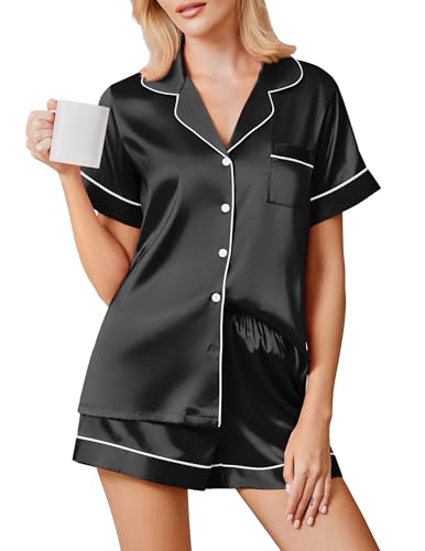 SWOMOG Silk Satin Pyjamas Black Pyjama Set for Women Short Sleeve Button Down Pj Set Comfy Pjs