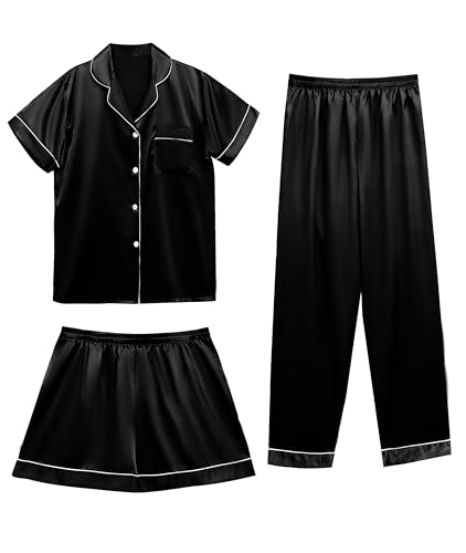 Vlazom Womens Silk Pyjamas, Satin Pyjamas Sets Ladies Silky Sleepwear 3 Piece Short Sleeve Pjs Set Button Down Loungewear Black,XL