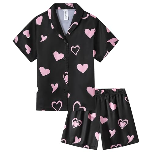 Ewbob Girls Silk Satin Pyjamas Set Short Sleeve Button-Down Kids PJs Breathable Soft Nightwear Children Sleepwear Age 5-14(C9-004)-Black Heart-7-8Y