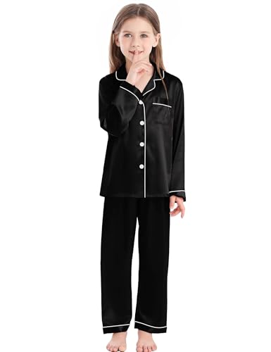 PythJooh Girls Satin Pyjamas Sets Girls Boys Long Sleeve Button-Down Pjs Set 2PCs Silky Nightwear Sleepwear for 3-13Years Black
