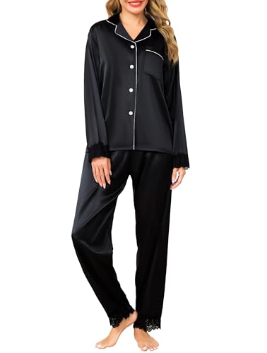 Vlazom Women's Pyjamas Set Satin Pjs Sets Two Piece Silk Pyjamas Elegant Lace Trim Pyjama Button Down Sleepwear Loungewear for All Seasons Black,L