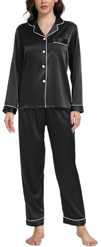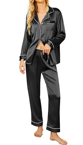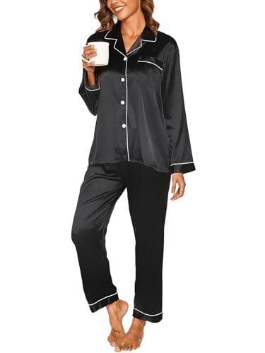 Ekouaer Pyjamas for Women Satin Pjs Set Two Piece Silk Pyjamas for Ladies Bride Pjs Button Down Loungewear Black L