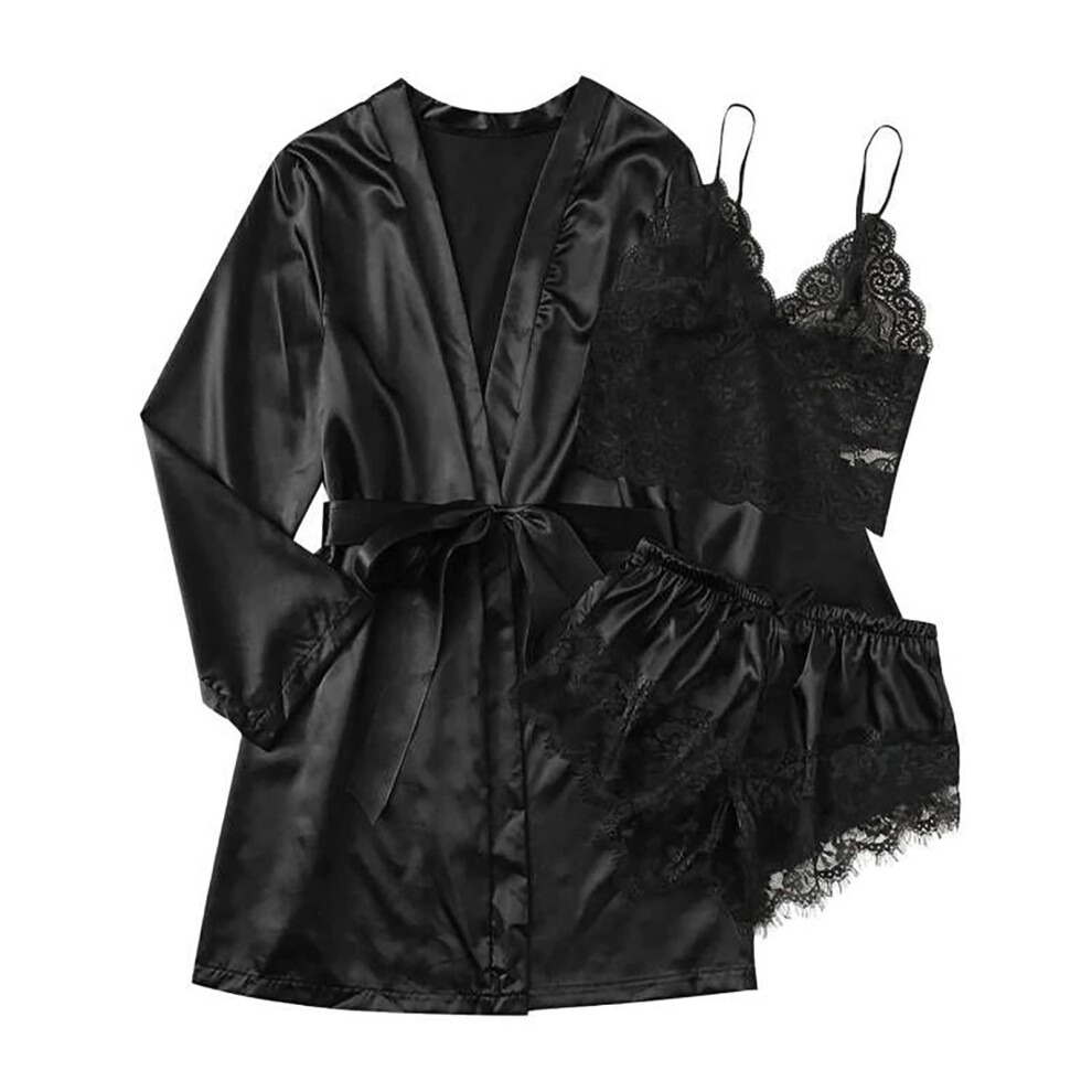 (Black, S) Satin Silk Lingerie Set Women Lace Cami Crop Top Shorts Pyjamas Sleepwear Nightwear