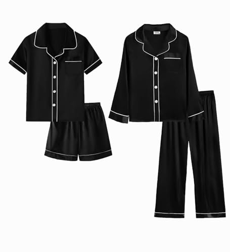 SWOMOG Kids Satin Pyjamas Sets Girls Boys Button-Down Pjs Short Sleeve Silk Nightwear 3 Pieces Lounge Sets Black