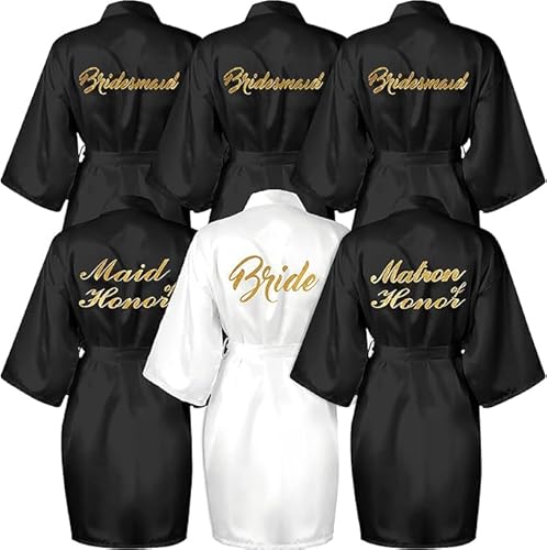 6 Piece Bridesmaid Satin Dressing Gown, Short Robe Bridesmaids of the Groom Robes Women Bridesmaid Morning Robes V-Neck Pyjamas for Bridal Wedding Party (Black/White)
