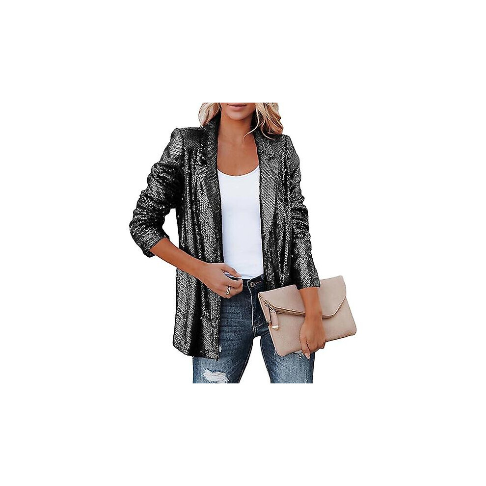 (Black, L) Women Sequin Jacket, Glitter Sparkle Casual Long Sleeve Blazer Coat