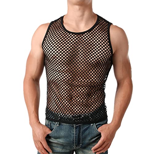 ROSVAJFY Mens Mesh Fishnet Vest Sexy See Through Tank Top Sheer Fitted Sleeveless String Undershirt, Stretch Muscle Tops Workout Hollow Out Tees Gym Sport Underwear for Clubwear Black