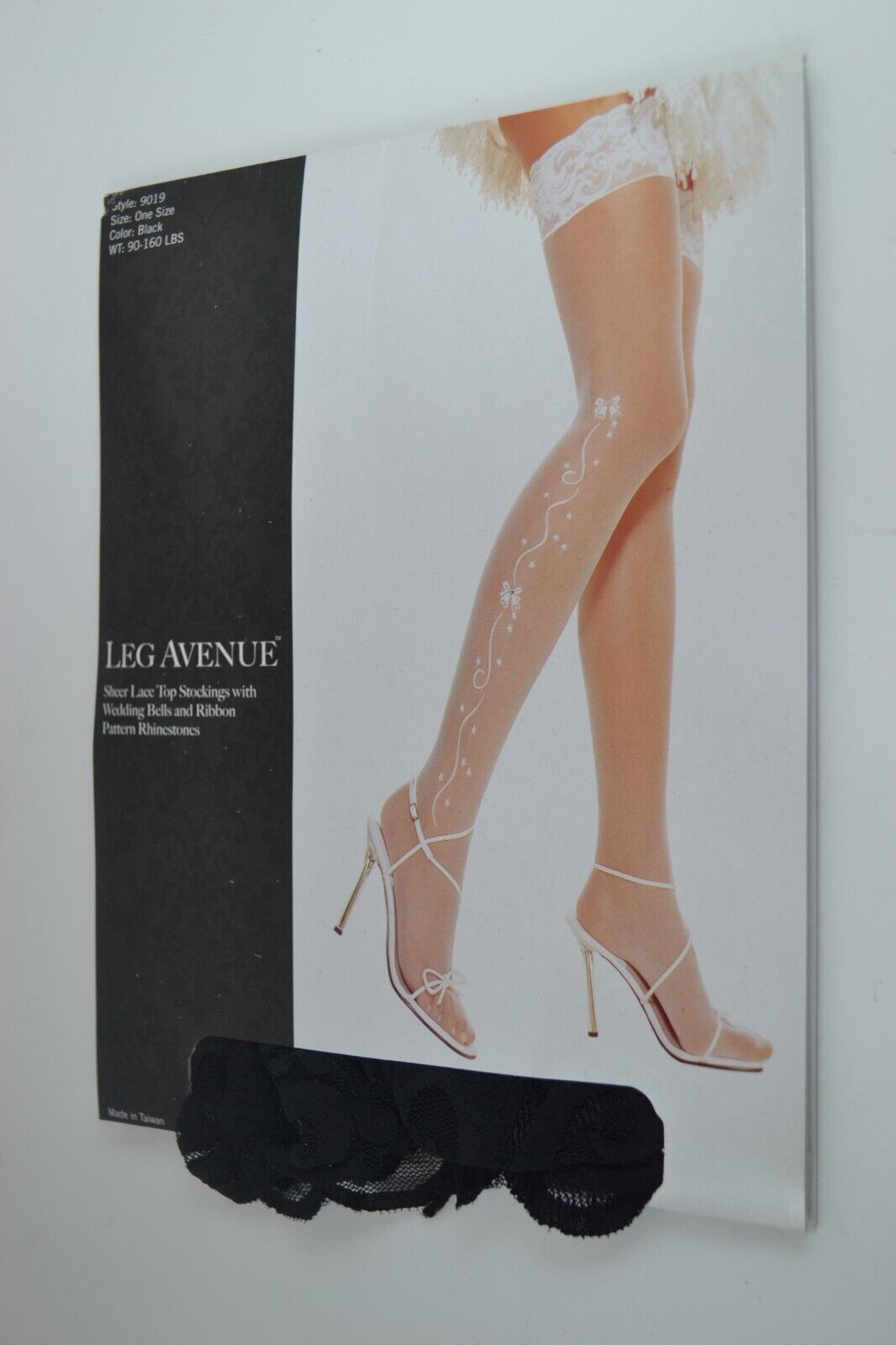 Black Sheer Stockings Lace Top Wedding Bells & Ribbon Pattern Leg Avenue Reduced