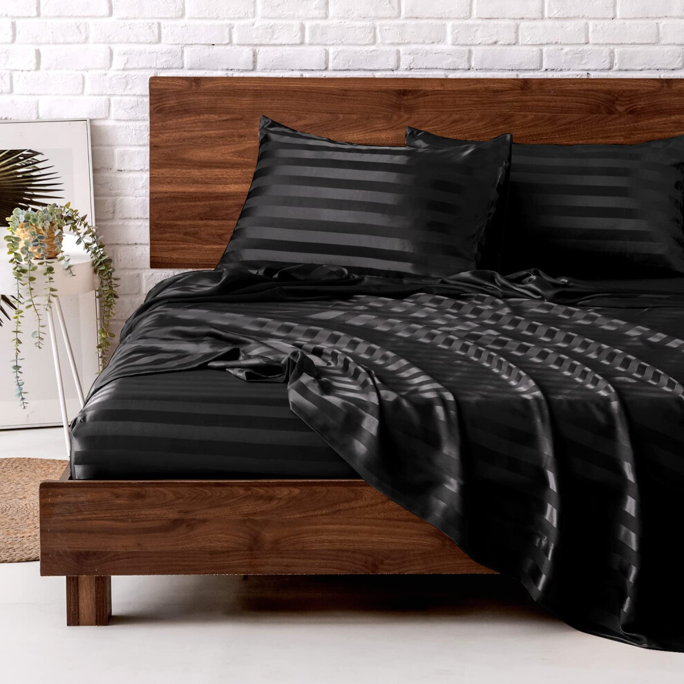 MR&HM Satin Bed Sheets King Size Sheets Set 4 Pcs Silky Bedding Set with 15 Inches Deep Pocket for Mattress(King Black Striped)