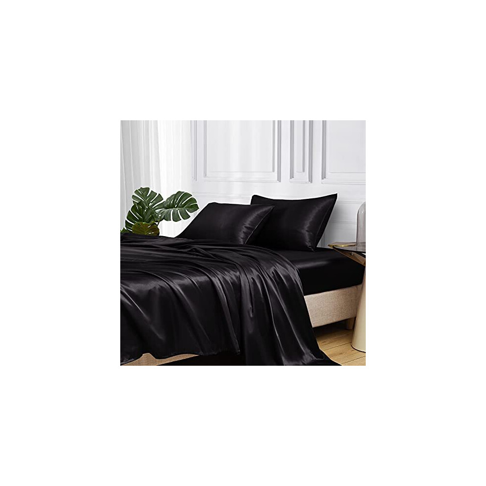 Homiest 4pcs Satin Sheets Set Luxury Silky Satin Bedding Set with Deep Pocket, 1 Fitted Sheet + 1 Flat Sheet + 2 Pillowcases (Queen Size, Black)