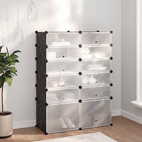 QJBSAVVA 12 Cube Storage Cabinet with Doors 165.5 x 31.5 x 93.5 cm Black PP Shoe Rack Organiser Modular Hallway Living Room Bedroom