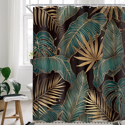 Cinbloo Emerald Green/Black/Gold/Brown Shower Curtain, 72" W x 72" H, Hawaiian Botanical Pattern with Abstract Palm Leaves Modern Style, 12 Hooks