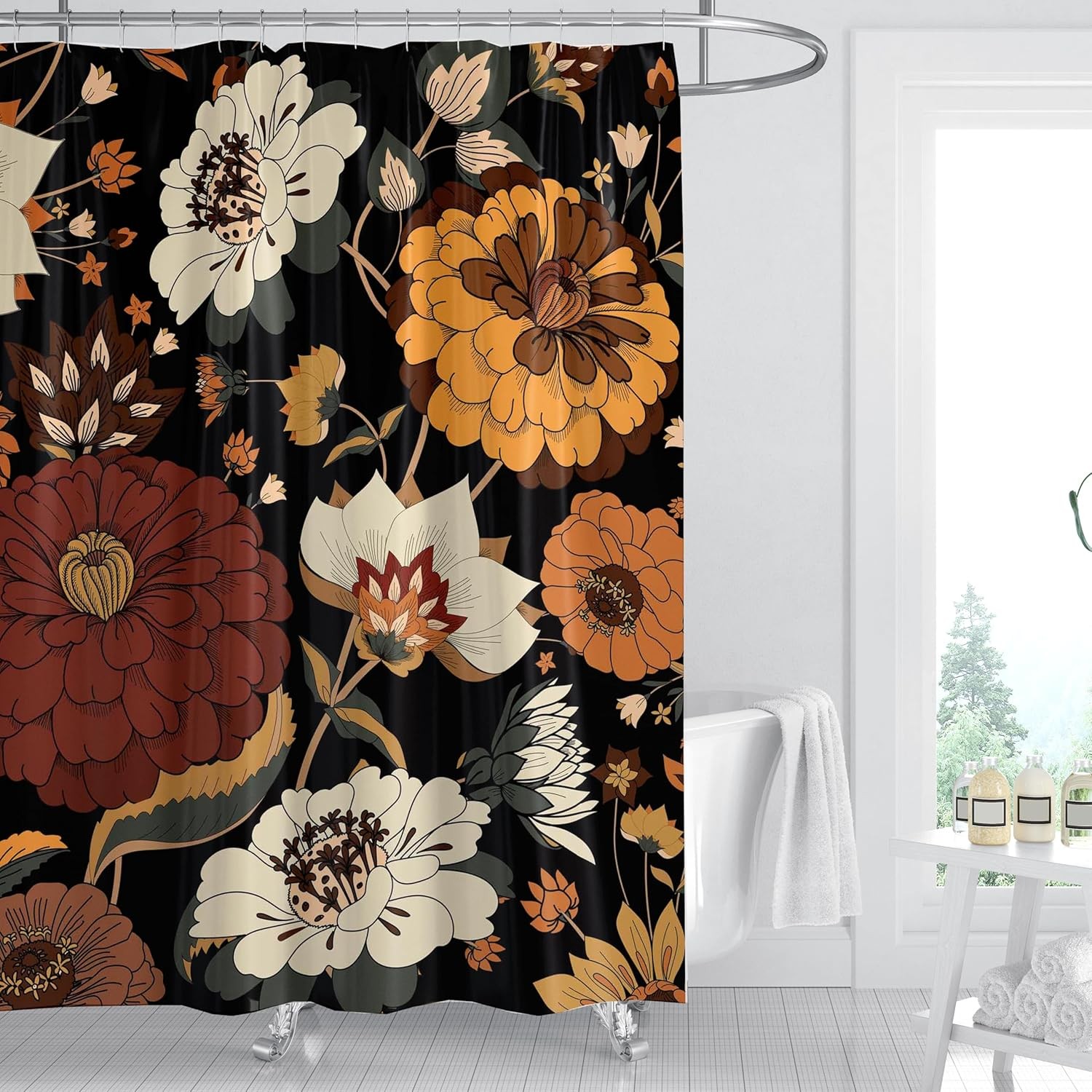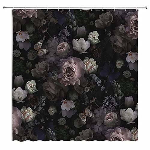 Black Floral Shower Curtain for Bathroom Set Dark Rose Blossom Flower Boho Victorian Spring Wildflower Woman Vintage Plant Bath Curtain 60 x 72 Inch Decorative Polyester Fabric Cloth Waterproof Decor