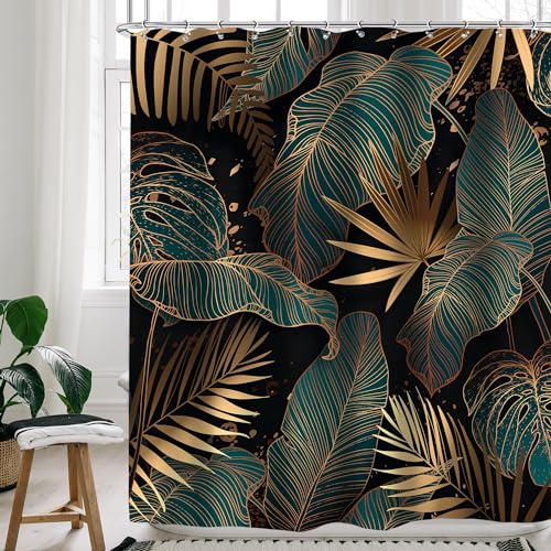 Cinbloo Green/Black/Gold Shower Curtain 60" W x 72" H, Abstract Modern Tropical Bathroom Decor with Hawaiian Palm Leaves and Monstera, 12 Hooks