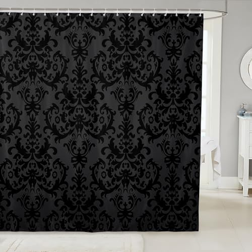 Erosebridal Adults Black Damask Shower Curtain - Antique Victorian Baroque Gothic 72" Wx72 L - Vintage Floral Bohemian Exotic Grey Bath Curtain With 12 Hooks - Bathroom Decor