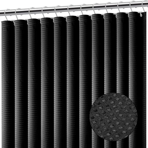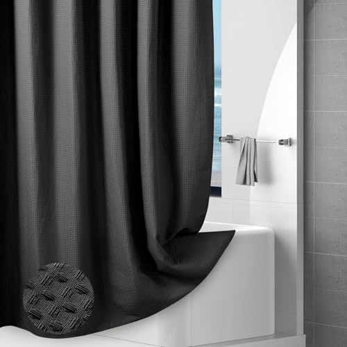 Hotel-Quality Black Waffle Shower Curtain, Water Repellent Bath Curtain Prevents Water Escaping, 256GSM Thick Heavy Duty Fabric Texture Wet Room Shower Curtains, Weighted Hem, Washable, 183x183cm