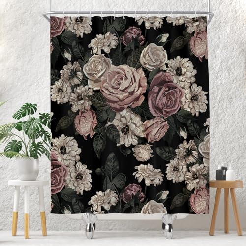 EDOMGNIH Black Floral Shower Curtain Retro Flower Bloosom Rustic Rose Watercolor Peony Vintage Leaves Spring Plant Boho Woman Fabric Bathroom Decor Set with Hooks(70" WX70 H)