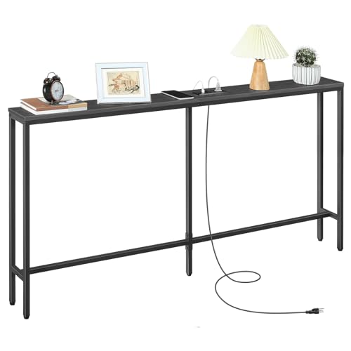 MAHANCRIS Skinny Console Table with Power Outlets, 160 cm Narrow Sofa Table, Behind Couch Table with Charging Station for Plants, Living Room, Black ACTBK165KE01